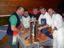 Idén (majdnem) teljes létszámban - 12-en - jöttünk össze töltésre. Fónai Laci előző esti ünneplésére felkészülve - már pénteken kora délután, a fűszerezést követően - három ládányi próbatöltést végeztettünk a vákumos szupertöltővel. Ennek eredménye lett a könnyed töltés az őszbe váltott időjárás ellenére.